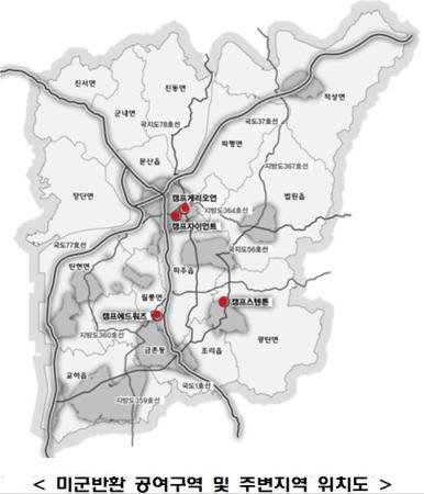 파주시는 미군반환공여지 4곳에 대해 사업자 공모를 통해 사업제안 및 민간투자를 유치할 예정이다. 사업대상지는 월롱면 영태리 캠프 에드워즈, 문산읍 선유리 캠프 자이언트와 캠프 개리오언, 광탄면 신산리 캠프 스탠턴이다.