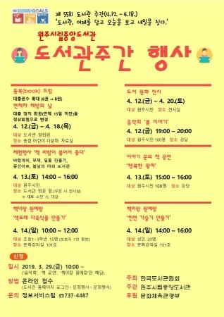 원주시립중앙도서관이 새봄을 맞아 오는 4월 12일부터 18일까지 도서관과 독서의 의미를 되새길 수 있는 제55회 도서관 주간을 운영한다.