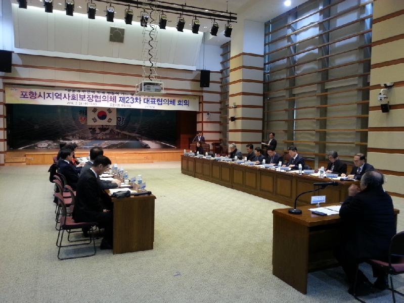 포항시가 24일 시청 대회의실에서 포항시지역사회보장 대표협의체 위원 26명이 참석한 가운데 제23차 대표협의체 회의를 가졌다. 이날 회의에서는 ‘함께 만들어가는 행복도시 포항’을 이뤄나가기 위해 2016년도에 시행할 지역사회복지계획 8개 중점추진사업과 19개 세부사업에 대해 구체적인 시행방안과 사업의 타당성 등에 대한 의견 제시와 2015년 포항시지역사회보장협의체 사업추진 결과보고 및 2016년도 운영계획안 심의 등 주요안건에 대해 논의했다.