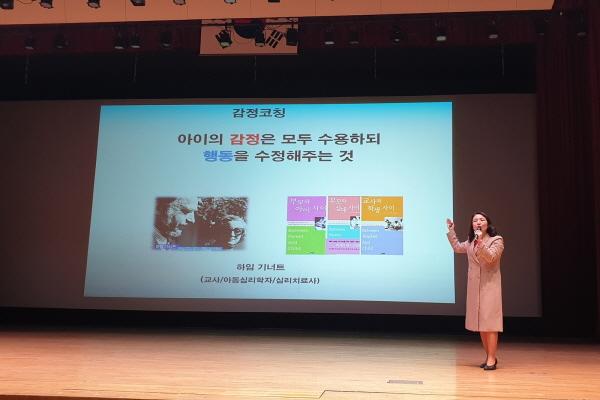 이날 교육에는 감정코칭협회 박현아 강사가 ‘부모감정코칭’이라는 주제로 스트레스를 관리하고 아이의 감정을 수용·존중하며 공감하는 대화 방법을 제시했다.