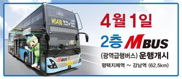평택시는 평택 지제역~강남역 노선에 전국 최초로 2층 M버스를 오는 4월 1일부터 운행한다고 밝혔다.