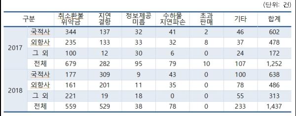 2018년 한국소비자원에 접수된 항공 관련 피해구제 접수건수는 1,437건으로 여객의 증가세와 함께 전년 대비 증가했다.