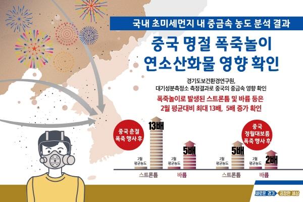 경기도 보건환경연구원은 지난달 평택성분측정소에서 ‘중금속 실시간 분석기’를 활용해 대기 중 중금속 농도를 측정한 결과, 중국 명절인 ‘춘절’과 ‘원소절’ 이틀 후인 지난달 7일과 21일 폭죽 연소산화물인스트론튬, 바륨, 칼륨, 마그네슘 등 4종의 중금속 농도가 크게 증가한 것으로 나타났다고 28일 밝혔다.