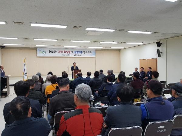 구리시는 지난 27일 구리시청 1층 상황실에서 관내 과수 농가를 대상으로 친환경 고품질 농산물의 안전 생산과 수급을 위한 화상병 및 돌발 해충 방제 교육을 실시했다.