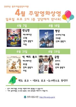 4월에는 어린이와 온 가족이 즐길 수 있는 ‘런닝맨’, ‘명당’, ‘빅 배드 폭스’, ‘궁합’을 매주 일요일 오후 2시 도서관 1층 강당에서 상영한다.