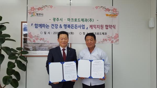 광주시는 지난 26일 ㈜마크로드제과에서 ‘함께하는 건강 & 행복든든사업’ 업무협약을 체결했다.