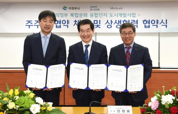 의정부시는 28일 의정부시청 2층 상황실에서 ㈜포스코건설 이영훈 대표, 의정부리듬시티 황영훈 대표와 의정부 복합문화 융합단지 도시개발사업의 성공적인 수행과 의정부시 발전을 도모하기 위한 주주간협약식 및 상생·협력 협약식을 체결했다.