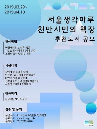서울시는 “오는 5월 뚝섬한강공원에서 선보일 휴식공간인 ‘서울생각마루’의 ‘천만시민의 책장’을 구성할 시민 추천 도서를 공모한다.”고 밝혔다.