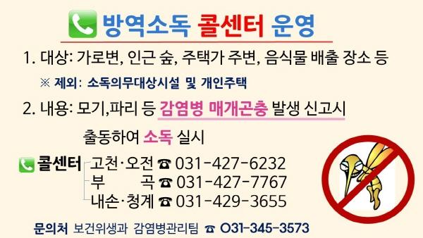 시는 본격적으로 모기 등 해충이 극성을 부리는 4월 중순부터 10월말까지 방역소독 전문방역업체를 통해 시 전역에 연막소독과 연무소독을 병행해 실시할 계획이다. 특히, 이 기간 중에는‘방역소독 바로 콜센터’를 운영해 민원 발생시 즉시 현장에 출동해 맞춤형 방역 서비스를 실시할 예정이다.