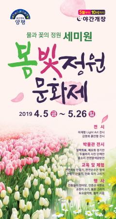 뿐만 아니라, 다양한 볼거리와 직접 참여할 수 있는 행사들도 준비되어 있다. 6만2천 평 규모의 세미원 야외정원에는 다양한 봄꽃이 피어, 봄빛 가득한 모습으로 관람객들을 맞을 계획이다. 튤립, 향수선화, 히아신스, 잉글랜드 양귀비, 수련 등이 구역 별로 봄꽃zone을 구성하고 있어 한껏 봄을 느낄 수 있다. 또한 야외전시, 이재형 라이트아트展, 김명희 테라코타展 ‘엄마의 정원’이 정원을 더욱 풍성하게 채울 예정이다.