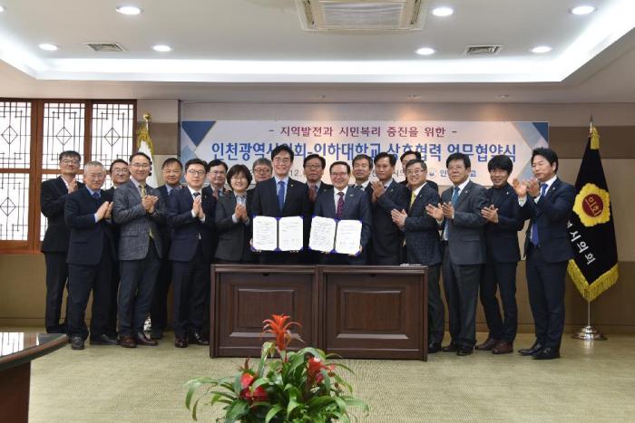 인하대(총장‧조명우)는 12일 조명우 총장 등 학교 관계자와 이용범 시의회의장을 포함한 시의원 9명 등 18명이 참석한 가운데 인천시의회 의장 접견실에서 ‘인하대-인천시의회 상호협력 업무협약식’을 열고 지역 발전을 도모하는 데 힘을 모으기로 합의했다고 밝혔다.