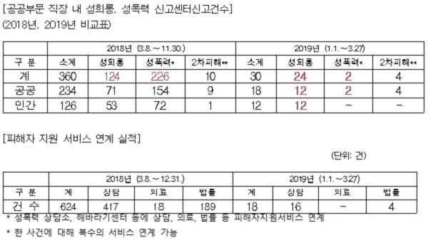 앞서 여성가족부는 올해부터 직장 내 성희롱, 성폭력 신고센터를 운영하며, 성희롱, 성폭력 2차 피해에 대한 신고를 받고 있다. 신고센터에 피해사실이 접수되면 해당기관에 사실조사, 공간 분리 등 신속한 조치 요청을 하고, 조직문화 컨설팅 등 피해자가 필요한 의료 및 법률지원 등을 지원한다.