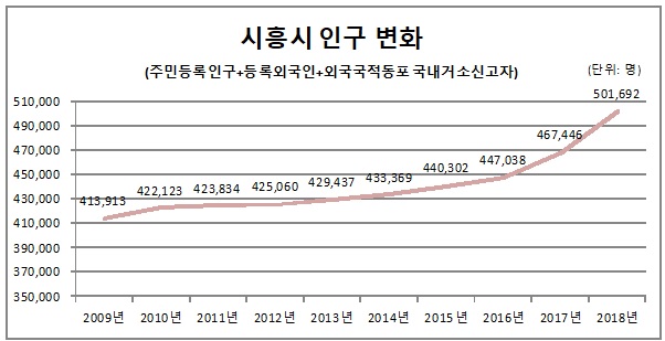 지난해 행정안전부가 발표한 ‘2018 인구통계’에 따르면, 2018년 시흥시 인구(등록외국인, 외국국적동포 국내거소신고자 미포함)는 2017년보다 29,023명 증가하며 인구증가율 전국 4위를 기록했다.