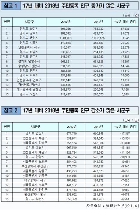 1위는 화성시(67,636↑), 2위는 김포시(31,078↑), 3위는 용인시(31,045↑)가 차지했다. 반대로 인근 안산시는 17,367명이 감소하며 전국 인구감소율 1위를 기록했다.