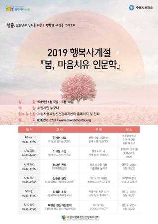수원시행복정신건강복지센터가 4월부터 오는 5월 청춘을 위로하는 인문학 강연 ‘2019 행복사계절 봄, 찾아가는 행복인문학’을 연다.