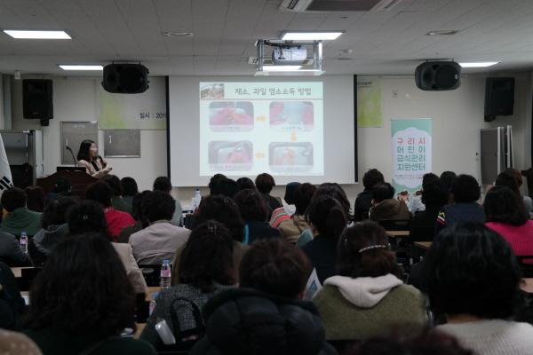 구리시어린이급식관리지원센터에서 주관한 이날 행사는 100여개의 어린이 급식 시설의 조리사가 참여했으며, 어린이 미각 발달 전문 최수진 강사가 저염·저당 소스와 채소·과일 염소 소독에 대해 교육했다.