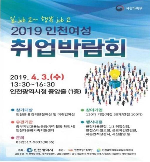 인천시와 광역여성새로일하기센터는 인천관내 7개 새일센터와 공동주관으로 4월 3일 오후1시30분부터 인천광역시청 중앙홀에서 취업을 희망하는 여성을 대상으로 ‘2019 인천여성 취업박람회’를 개최한다.