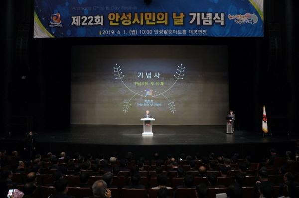 안성시는 1일 안성맞춤아트홀 대공연장에서 우석제 시장을 비롯해 국회의원, 시의회의장, 도의원, 시의원, 각 기관사회단체장, 시민 등 1000여명이 참석한 가운데 '제22회 안성시민의 날' 기념행사를 개최했다.