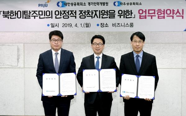 파주시는 1일 파주시청 비즈니스룸에서 대한상공회의소 경기인력개발원, 파주상공회의소와 북한이탈주민의 안정적인 정착을 위한 업무협약식을 가졌다.