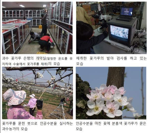 농촌진흥청은 과수농가의 인공수분 작업 시기를 앞두고 전국 시·군농업기술센터에서 운영 중인 '과수 꽃가루 은행'의 적극적인 이용을 당부했다.