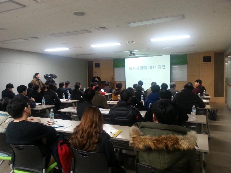 | 울산대학교 건축학부 한삼건 교수가 포항시 공무원 및 건축사회 회원을 대상으로 도시재생에 대한 강의를 진행하고 있다. |