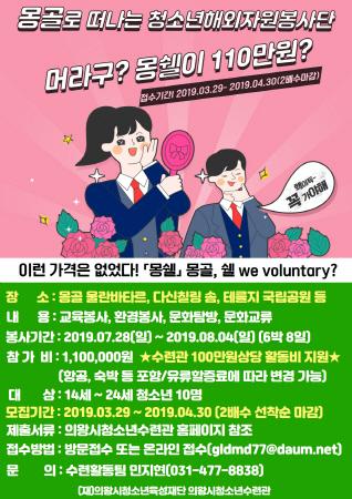 이번 2019 청소년 해외자원봉사단 ‘몽쉘’ 몽골, 쉘 we voluntary? 프로그램은 청소년들이 몽골 현지 체험활동을 통해 지구촌 환경문제를 인식하고 글로벌 리더십을 함양하도록 하기 위해 마련됐다.