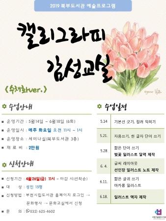 부천시립북부도서관은 오는 5월 14일부터 6월 18일까지 매주 화요일 ‘캘리그라피 감성교실’ 강좌를 운영한다.