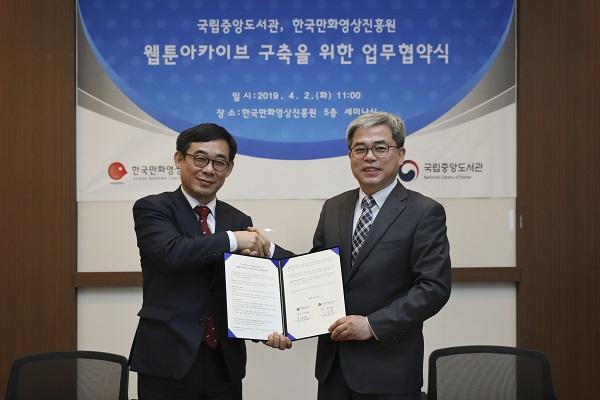한국만화영상진흥원과 국립중앙도서관은 2일 11시 한국만화영상진흥원 5층 세미나실에서 웹툰 아카이브 구축 사업을 위한 업무 협약을 체결했다.