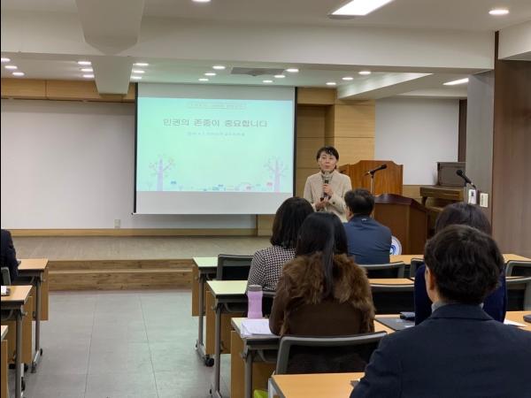 이 날 교육은 한국양성평등교육진흥원 박인경 강사의 ‘인권의 존중이 중요한다’라는 주제로 가정폭력의 본질 이해와 인식 변화, 가정폭력 대응 방법 소개, 가정폭력이 성매매로 전환되는 과정, 성매매에 대한 잘못된 통념의 소개 등을 다양한 예시와 함께 전달했다.