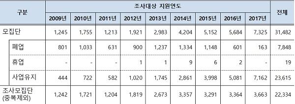 동 조사는 매년 중소벤처기업부에서 창업지원사업을 수행한 창업기업을 대상으로 생존율, 고용성과, 재무성과 및 혁신성과 등을 추적 조사하는 것으로, 이번 조사는 창업진흥원이 중소기업연구원에 위탁해 ’2009년부터 ’2017년까지 지원한 기업 22,334개를 대상으로 실시했다.