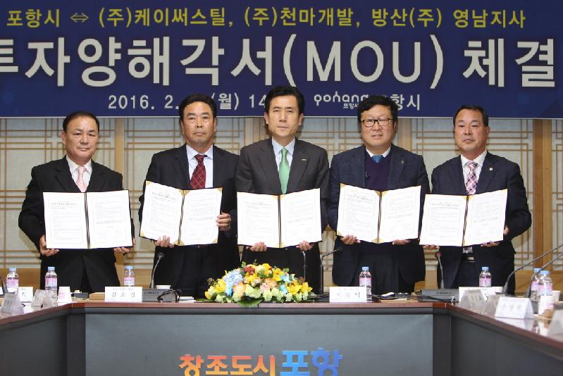 포항시가 29일 시청 중회의실에서 철판표면가공업의 ㈜케이써스틸(차원석 대표), 목재사업의 ㈜천마개발(김효경 대표이사), 내화물제조업의 방산(주) 영남지사(방순만 대표) 등 3개 기업체와 153억원의 사업투자와 47명의 일자리창출이 기대되는 투자양해각서(MOU)를 체결했다. 이날은 이강덕 포항시장, 정수화 시의원 등 관계자 17명이 참석한 가운데 기업사업계획 설명과 함께 포항시의 신속한 행정지원으로 빠른 기간 내 공장이 설립되도록 하는 투자협약을 맺었다. 포항시 북구 청하면 하대리에 공장설립을 하는 ㈜케이써스틸과 ㈜천마개발은 40,042㎡의 동일한 부지에 제조시설 2,021㎡와 3,479㎡를 각각 설치하고, 3D 패턴무늬의 철판제품 생산과 금강송을 활용한 목재사업을 추진할 계획이다. 인천시 남동구 논현동에서 고부가가치 제품개발을 위해 기술연구를 하고 있는 ㈜케이써스틸은 기계설비 등에 110억원을 투자하고 27명의 고용인원으로 냉장고, 세탁기 등 가전제품과 엘리베이터 등 건설자재를 제공할 계획이며, 미주하이텍 및 중국기업체와 사전구매의향서를 체결하는 등 판로개척에도 발 빠른 행보를 보이고 있다. ㈜천마개발은 부지매입과 목재사업 추진에 필요한 시설 등에 28억원을 투자하고 10명의 인원을 채용해 문화재복원사업, 한옥마을조성, 조경사업 등에 쓰여질 금강송 원목을 제품화해 판매처에 제공할 계획이다. 북구 신광면 안덕길에 위치한 방산(주) 영남지사는 제조시설 2,740㎡ 규모에 15억원을 투자하고 10명의 인원을 채용해 해외에서 1차 가공된 비금속 광물을 내화물 부원료로 생산할 계획에 있다. ㈜천마개발 김효경 대표이사는 “우수한 철강산업의 입지조건과 도로 등 물류 인프라가 잘 갖춰져 있는 포항시에서 사업을 하게 되어 기쁘다”며 “2018년에는 ㈜케이써스틸과 함께 매출액 950억원과 고용인원도 140명으로 확대해 나가겠다”고 사업계획을 밝혔다. 또한 이번 MOU 체결에 있어 포항시와 시의회의 적극적인 관심과 지원에 대한 고마움의 표시로 민선6기 시정운영 슬로건인 ‘함께하는 변화, 도약하는 포항’과 ‘창조도시 포항’의 이미지를 담은 샘플제품을 포항시장에게 전달하기도 했다 이강덕 포항시장은 “이번 투자유치양해각서를 체결한 기업체에서 지역의 우수한 산업인력을 우선적으로 고용되도록 하고, 공장건축 시에도 지역에서 생산되는 자재, 장비가 사용되도록 기업체와 협의하겠다”며 “최근 철강산업이 어려운데도 불구하고 포항지역에 투자를 결정해주신 기업체 관계자에게 감사하다”고 말했다.