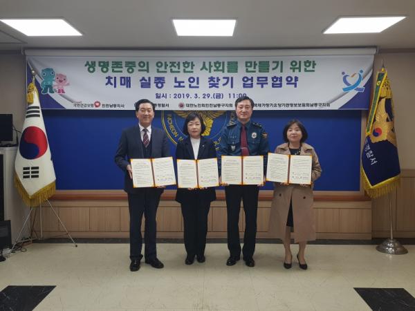 대한노인회인천남동구지회는 최근 인천남동경찰서 2층 소회의실에서 인천남동경찰서, 국민건강보험공단인천남동지사, 한국재가장기요양지관정보협회와 ‘치매노인 실종예방 및 신속 발견을 위한 지원 업무협약’을 체결했다.