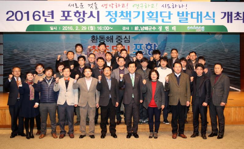 민선6기 이강덕 포항시장의 핵심 시정방향인 소통과 협업을 통한 시정 현안과제 연구와 정책개발을 위한 다양하고 창의적인 아이디어 발굴 활동을 펼치게 될 ‘포항시 정책기획단’이 본격적인 활동에 들어갔다. 포항시는 29일, 6급 이하 공무원 30명으로 구성된 ‘정책기획단’의 발대식을 갖고, 오는 10월까지 6개팀(사람 모으기 1·2팀, 돈 모으기 팀, 매력 만들기 팀, 바다 빛내기 팀, 누구나 잘 살기 팀)으로 나눠 다각적인 시야에서 평소에 생각하지 못했던 새로운 아이디어를 발굴하여 시정에 반영할 예정이다. 또한 현안사업이나 제도개선 과제 등 다양한 주제로 사업현장을 찾아서 직접 보고, 현장의 목소리를 듣는 등 현장 중심의 토론을 통해 시정발전에 도움이 될 의견 제시와 타 기관의 다양한 선진사례를 벤치마킹하는 등 지역에 접목할만한 방안을 모색하고 창의적인 정책 개발도 병행할 예정이다. 특히 포항시는 심화토론 등을 통해 제안의 질을 높일 수 있도록 적극 지원하는 한편, ‘정책기획단’에서 제시된 우수한 아이디어가 사장되지 않도록 간부회의 등의 검토를 거쳐 시정에 적극 반영하기로 하는 등 상향식 제안제도를 본격 자리 잡게 한다는 방침이다. 이날 발대식에 참석한 이강덕 포항시장은 “변화와 혁신은 작은 아이디어에서 시작되는 만큼, 제도와 관행에 얽매이지 않고 시민의 입장에서, 시민이 편리하고 시민이 피부로 느낄 수 있는 실질적인 아이디어를 적극 발굴 해 달라.”고 당부한데 이어 “정책기획단이 새로운 포항의 백년대계(百年大計)를 준비하는 소중한 산실이 될 수 있기를 바란다.”고 말했다. ‘포항시 정책기획단’은 매달 2번 이상의 토론모임과 함께 교수를 비롯한 전문가 등을 초빙한 간담회 개최, 현장답사 등을 통해 정책개발 활동을 수행하게 되며, 오는 10월에 최종 정책연구과제 발표회를 갖고 그동안의 결과를 발표할 예정이다. 한편, 이날 발대식에는 자치분권민주지도자회의 공동대표인 정현태 전 남해군수를 초청하여 ‘창조마인드와 포항시의 미래전략’이라는 주제로 특강을 갖고 ‘정책기획단’이 앞으로 추진하게 될 정책개발의 마인드 함양과 로드맵을 제시하는 시간을 가졌다.
