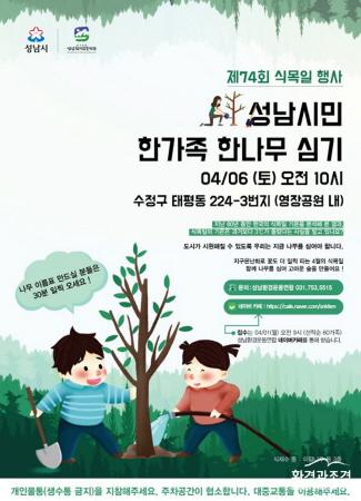 성남시는 오는 6일 오전 10시 수정구 태평동 영장산 기슭의 근린공원에서 제74회 식목일을 기념한 나무 심기 행사를 연다. 이날 행사에는 은수미 성남시장과 가족 단위 시민 300여 명이 참석한다.