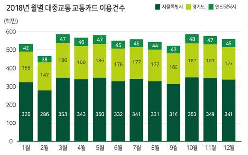 지난 한 해 수도권에서는 6,777만 명이 66억 6천만 건의 교통카드를 사용했다. 이는 하루에 719만 명이 대중교통을 이용한 것이다. 지역별 일평균 교통카드 사용자 수는 서울이 390만 명, 경기 260만 명, 인천 68만 명이었다.