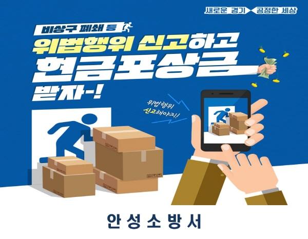 신고방법은 포상금 지급 신청서와 위반행위에 대한 증빙자료를 첨부해 안성소방서 재난예방과로 방문하거나 우편 및 팩스 등으로 접수하면 된다.