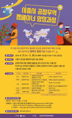 시흥시는 공정무역을 활성화하고 공정무역에 대한 인식을 확산하기 위한 ‘2019년 공정무역 캠페이너 양성과정’ 교육생을 모집하고 있다.