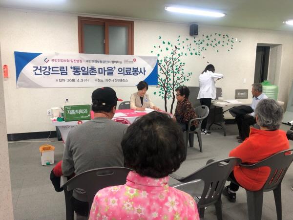 국민건강보험공단 파주지사와 일산병원은 검진 및 검사시설을 갖춘 대형진료버스 2대와 통일촌마을이 마련한 임시진료소에서 장단지역의 주민 300여명을 대상으로 혈액·혈당 측정 등 건강검진과 재활의학과, 가정의학과, 안과, 치과의 진료를 진행했다.