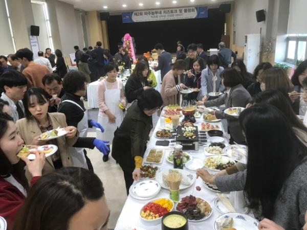 유가공 관련 단체장 및 낙농 농가 100여명이 참석한 치즈 품평회는 참여 치즈가공 연구 모임 회원 18명이 농산물종합가공센터 내 유가공장비와 숙성실을 활용해 만든 치즈와 요구르트, 치즈를 이용한 다양한 요리를 전시하고 맛을 평가했다.
