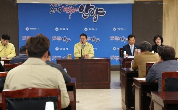 최대호 안양시장이 4일 홍역발생에 따른 긴급 기자회견을 열어 홍역확진 예방에 모든 노력을 다할 것이라고 말했다. 아울러 향후 발생할 수 있는 전염병에 선제적으로 대응해 나갈 것이라고 강조했다.