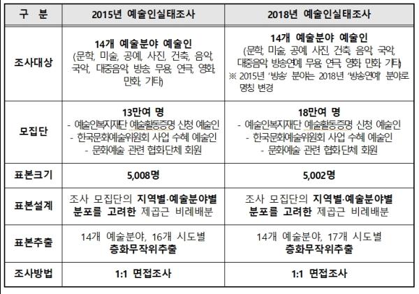‘예술인 복지법’ 제4조의2에 따라 3년마다 시행되는 예술인 실태조사는 2015년 전면 개편 이후 두 번째 시행됐으며, 이번에는 14개 분야별 예술인 구성 비중을 반영해 전국 17개 시도의 모집단 중 예술인 총 5,002명을 1:1 면접 방식으로 조사했다. 조사는 2018년 5월부터 11월까지 6개월 동안 진행됐으며, 조사 기준시점은 2017년이다.