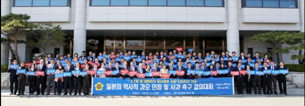 경기도의회는 4일 본회의 직후 경기도의회 현관 앞에서 염낙원 광복회 경기도지부장 등 광복회 회원들과 함께 ‘일본에 대한 역사적 과오 인정 및 사과 촉구 결의대회’를 가졌다.