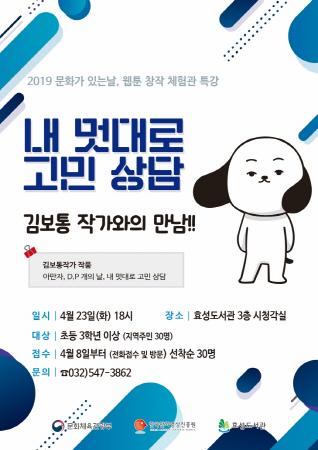 인천 계양구 효성도서관은 문화가 있는 날 오는 23일에 만화가 겸 수필가로 활동 중인‘김보통 작가와의 만남’을 운영한다.