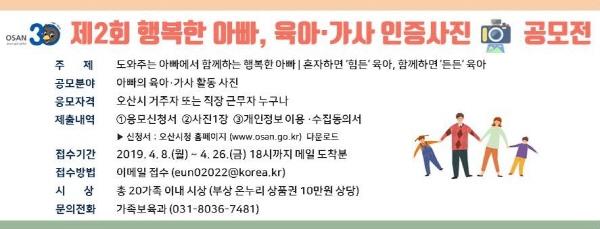 오산시는 건강한 육아문화 조성의 일환으로 가정 내에서의 아빠의 역할을 담은 ‘제2회 행복한 아빠, 육아·가사 사진 공모전’을 개최할 예정이다.