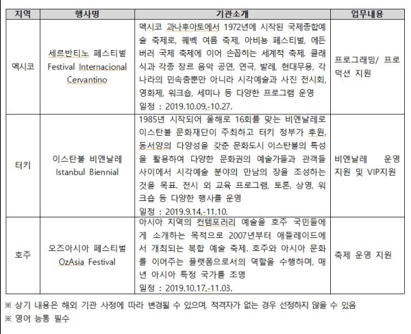 경력 3년 미만의 신진인력은 세계적 축제로 손꼽히는 멕시코의 ‘세르반티노 페스티벌’, 호주의 ‘오즈아시아 페스티벌’, 터키의 ‘이스탄불 비엔날레’ 등 해외 주요 문화행사에 실습 직원으로 참여해 국제 문화예술 행사가 어떻게 운영되는지 직접 체험하고 실습할 기회를 얻는다.