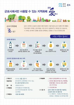 한편 시민 공모를 통해 확정된 군포시 지역화폐 명칭 ‘군포愛머니’는 ‘군포사랑이 가득한, 군포사랑을 시민 모두가 실천하는 지역화폐’라는 뜻을 담고 있다. 기타 더 자세한 지역화폐 운영 정보 및 사용 문의는 시청 지역경제과로 전화하면 안내받을 수 있다.