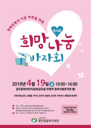 사회복지법인 평안밀알복지재단은 오는 19일 공도 중앙어린이공원에서 ‘제10회 희망나눔 바자회’를 개최한다.