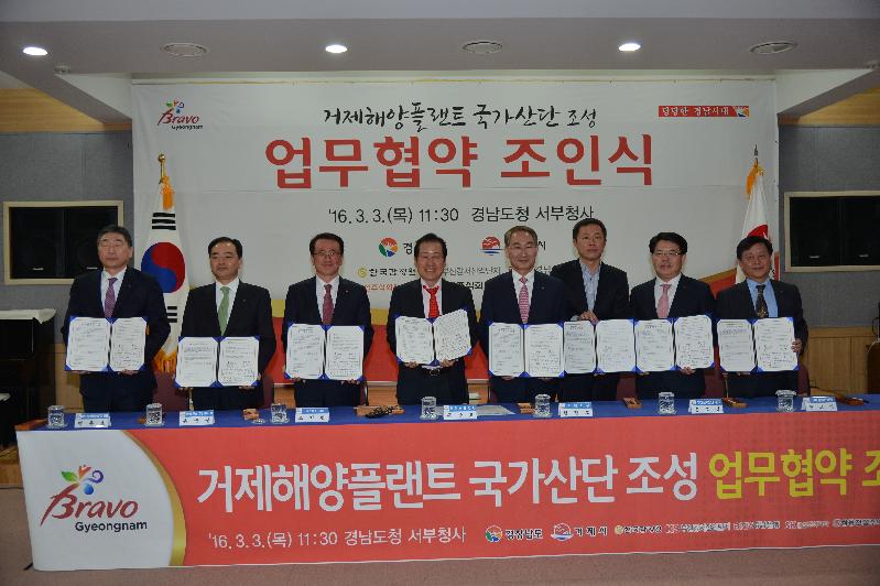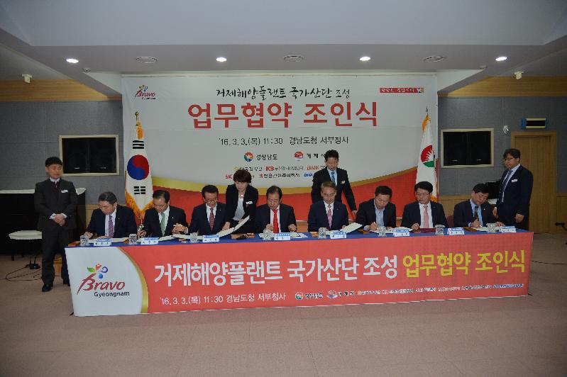 거제 해양플랜트 국가산단 건설투자자로 SK건설(72%), 쌍용건설(14%), 대우조선해양건설(14%) 컨소시업이 최종 확정되어 경남도와 거제시, 한국감정원, 실수요조합, 경남은행, 건설투자자가 3일 경남도 서부청사에서 거제 해양플랜트 국가산단 본격 조성을 위한 업무협약 조인식을 가졌다.