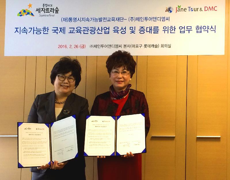 통영시지속가능발전교육재단(이사장 박은경)과 ㈜제인투어앤디엠씨(대표이사 한정규)는 외국인 교육연수 통영 유치를 위한 협약을 지난 2월 26일 서울에서 체결했다.