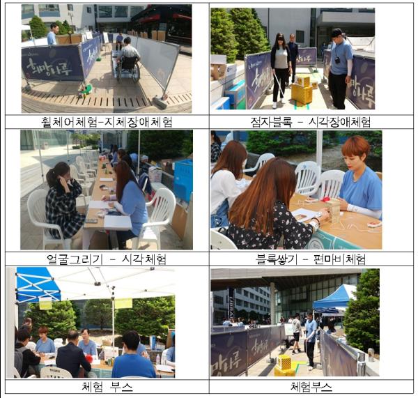 장애인편의시설 장애체험은 휠체어, 내인생의자화상, 나의강한떨림으로 구성된다. 편의시설체험은 3구역으로 조성된 세트장에서 지체·시각·편마비·무장애 존을 체험하는 방식으로 진행된다.